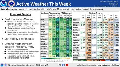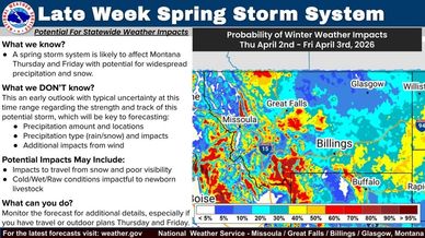 A spring storm system is likely to affect Montana Thursday and Friday with potential for widespread precipitation and snow. Stay tuned for additional details as the forecast evolves this week, especially if you have travel or outdoor plans Thursday and Friday.