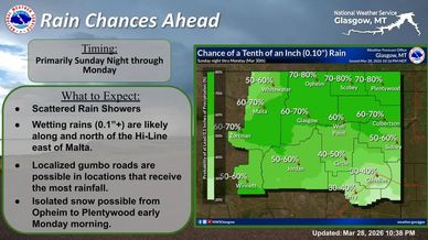 A disturbance will bring increasing rain chance to the region Sunday night into Monday with up to an 0.10” inch possible, especially along the Hi-Line. Isolated snow may be possible from Opheim to Plentywood Monday morning. Gumbo roads are possible in areas with the most precipitation.