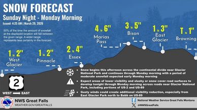 Snow develops this afternoon across the continental divide near Glacier National Park and continues through Monday morning with a period of moderate snowfall expected early Monday morning. Expect areas of lower visibility and slushy or snow cover road surfaces near Glacier National Park, including portions of US-2 and US-89.